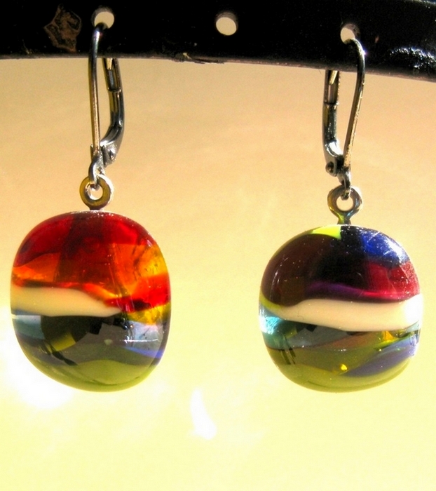 MILLEFIORI GLASS EARRINGS HANDMADE IN QUEBECDelicate little multi colored fused glass earrings which make the difference. The handmade glass cabochons measure just about 1/2" in diameter and are suspended from hypoallergenic stainless steel fish hook findings. Each glass cabochon has been made by cutting and layering several separate pieces of glass and fusing them together in a high temperature kiln at 1400F (760 Celsius). They are properly annealed to ensure strength and durability. The cabs have been glued in place using special UV glass glue.